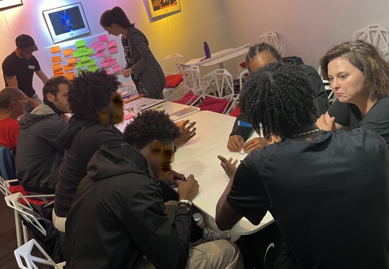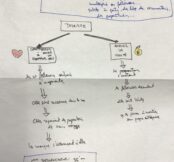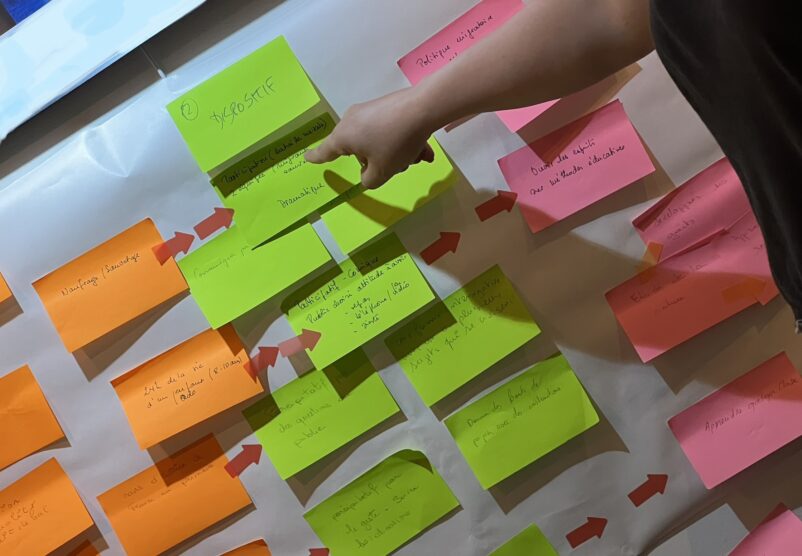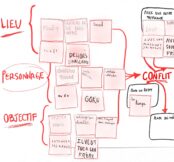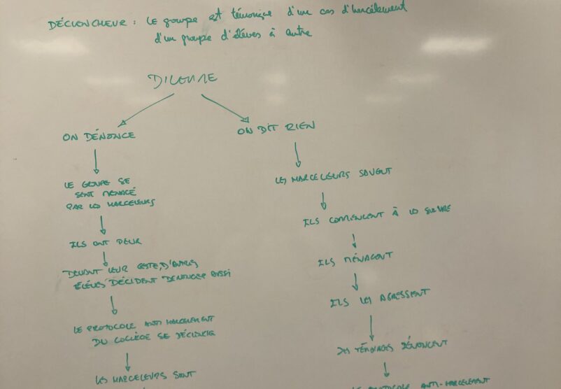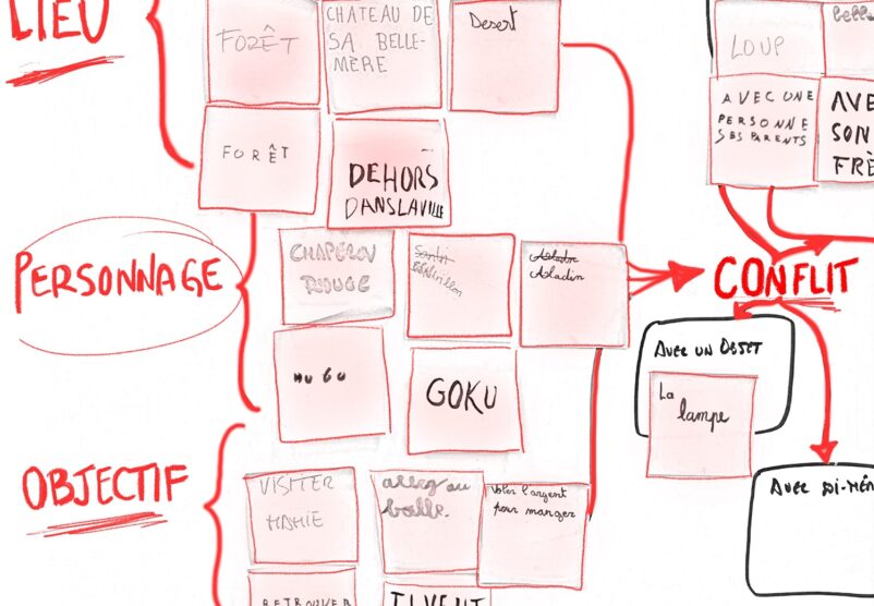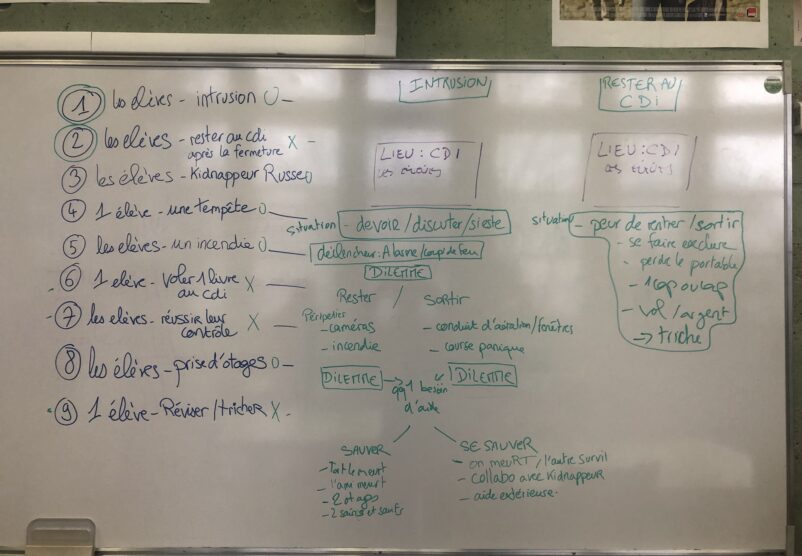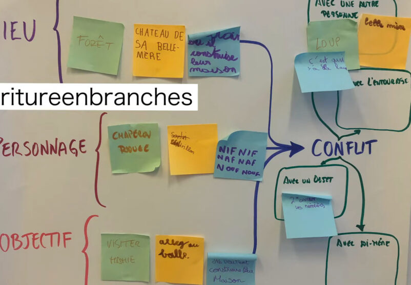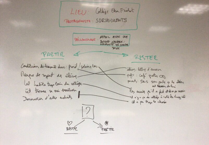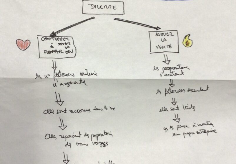 Le noyau du projet est donc la construction d’une fiction, créée par les participants de façon collective, avec un but participatif lors de la restitution. Nous utilisons la technique de l’écriture narrative en branches : comme le format des romans Choisis ta propre aventure ou comme des propositions de jeux vidéo où l’histoire évolue en fonction des choix du joueur. Nous construisons une histoire avec ces principes dans le but d’aboutir à une écriture qui sera toujours finalisée par le public en direct.
